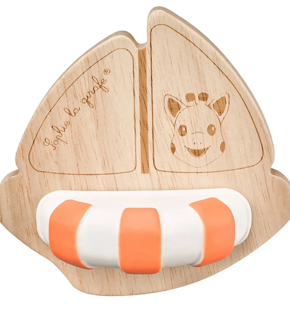 Skønt Sophie la Girafe badelegetøj i form af denne sejlbåd i heveatræ med giraffen Sophie på, som holder sig flydende på vandet ved hjælp af en hvid og orange redningskrans i naturgummi.