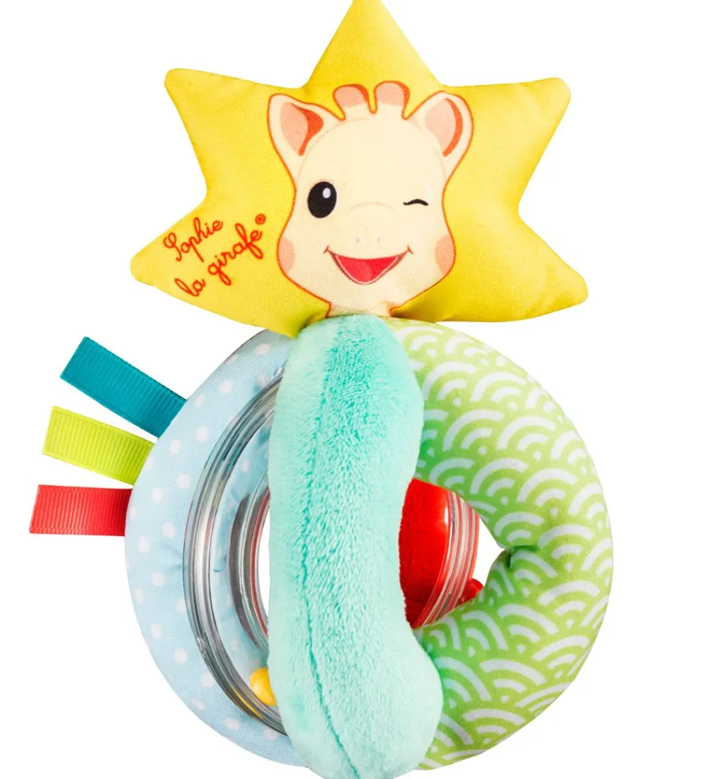 Sophie la Girafe ranglen består af fire farvede stof dele, hvor to er i blød velour. Der er yderligere to dele i gennemsigtig plast, med farverige perler som kører rundt. I den ene side er der tre mærker, så der er massere at lege med.