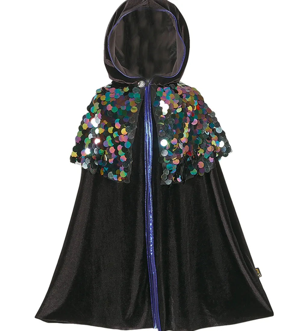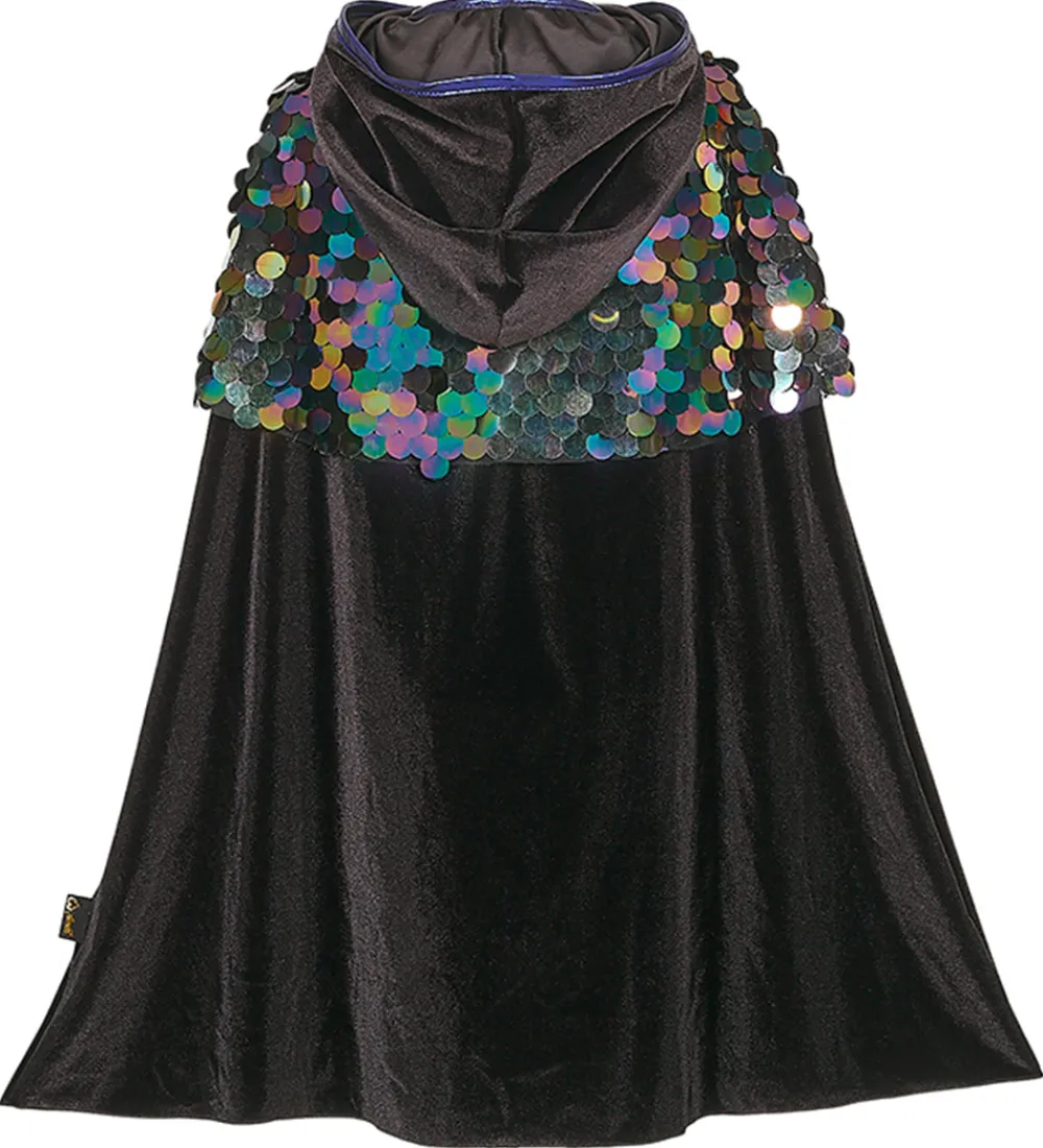 Souza udklædningen er i sort velour med blåskinnende kanter, og den er dekoreret med store palietter i grøn og lilla. Kappen har hætte og lukkes under hagen med en elastikstrop om en smukt ornamenteret knap.