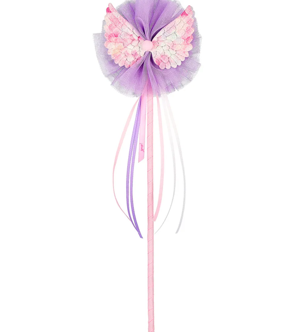 Sej Souza tryllestav i rosa med en top i lilla tyl og glimmervinger i rosa, lilla og mint. Tryllestaven har også fine bånd i rosa, hvid og lilla.