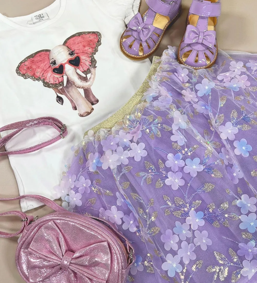 Yndig Souza udklædning i form af et tylnederdel i lilla med blomsterapplikationer af palietter.