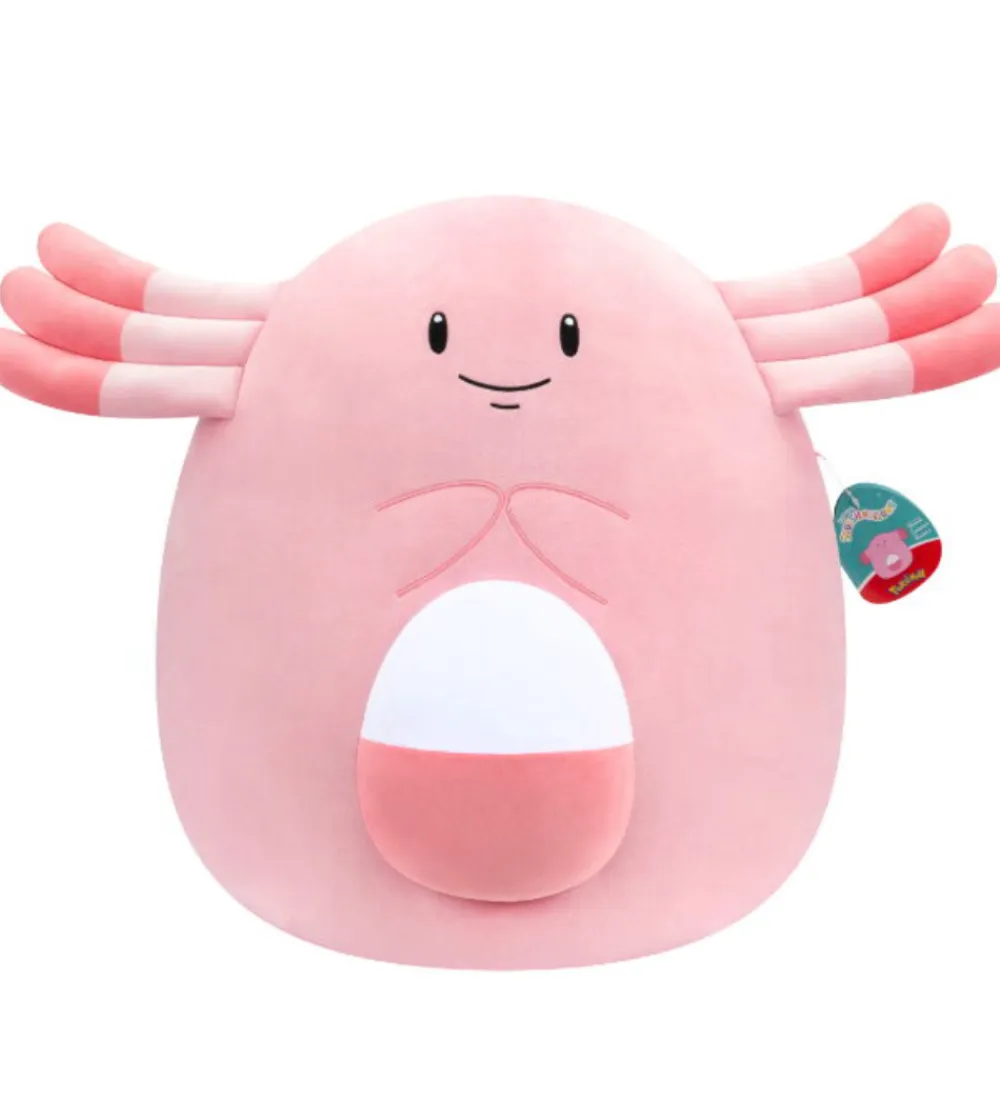 Fin Squishmallows bamse i form af Chansey fra Pokémon-universtet i rosa.