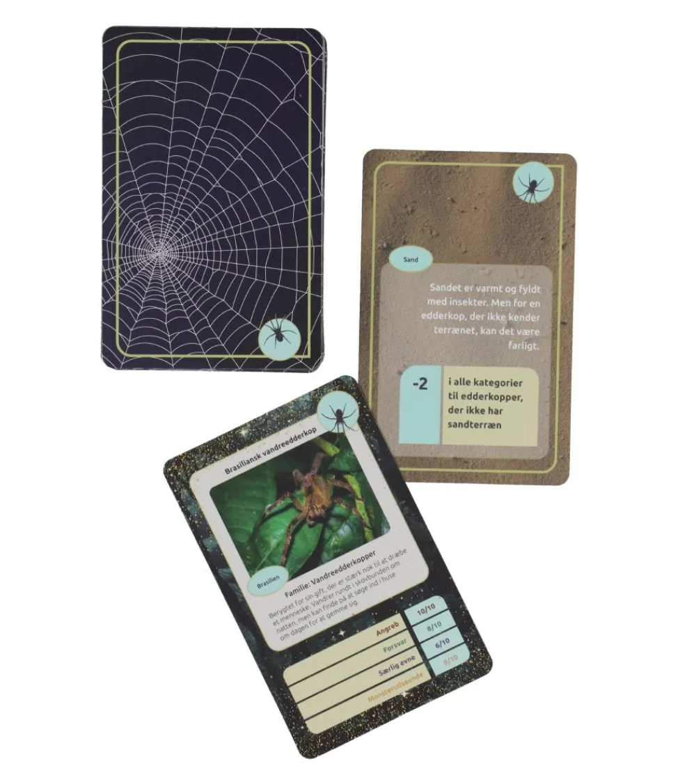 Kortspillet består af 49 kort med monsterflotte fotos af alverdens edderkopper. På hvert kort kan du læse mere om hver enkelt art, der har fået karakterer i fire forskellige kategorier – ‘Angreb’, ‘Forsvar’, ‘Særlig evne’ og ‘Monsterudseende’. Spillet passer i sin grundform perfekt til børn i indskolingen, mens elever på mellemtrinnet kan gøre brug af ekstrakort for at gøre spillet sværere og sjovere.