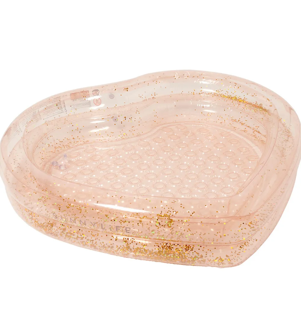 Flot SunnyLife badebassin i formet som et hjerte i transparent rosa og med guldglimmer.