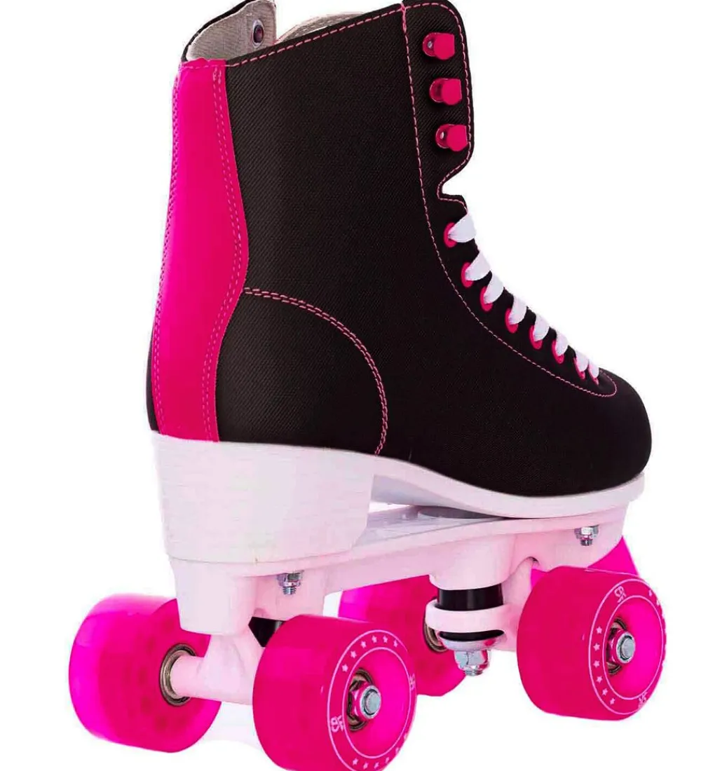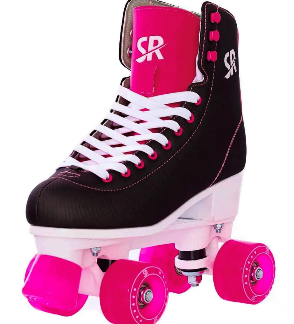 Seje Supreme rulleskøjter i sort med hvide snørebånd og detaljer i pink. På pløsen og ydersiden står der “SR” med hvid skrift.