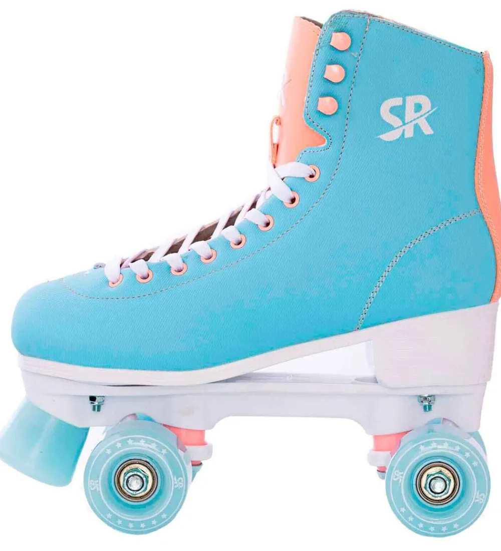 Seje Supreme rulleskøjter i lyseblå med hvide snørebånd og rosa detaljer. På pløsen og ydersiden står der “SR” med hvid skrift.