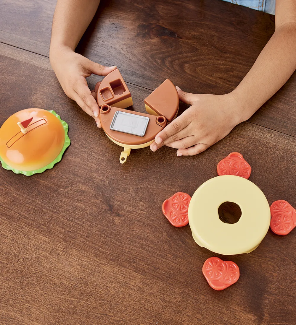 Flot Sylvanian Families legetøj i form af denne hamburger stand-sæt, hvor der medfølger en katte-figur med scooter og burgerformet stand samt masser af legemad og tilbehør.