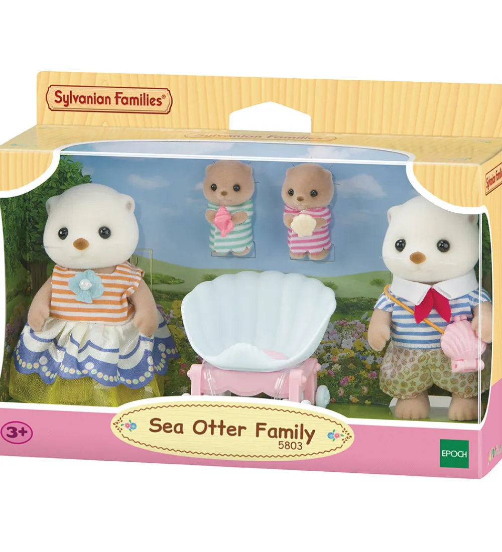 Sødt Sylvanian Families figursæt, der indeholder en familie af figurer (Sea Otter Family) og en dobbelt klapvohn formet som en muslingeskal.