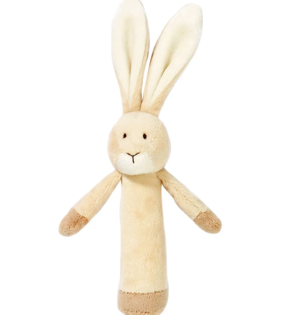 Sød Teddykompaniet rangle i en aflang form med et kaninhoved på toppen samt med sjove arme der dingler, når man ryster den.