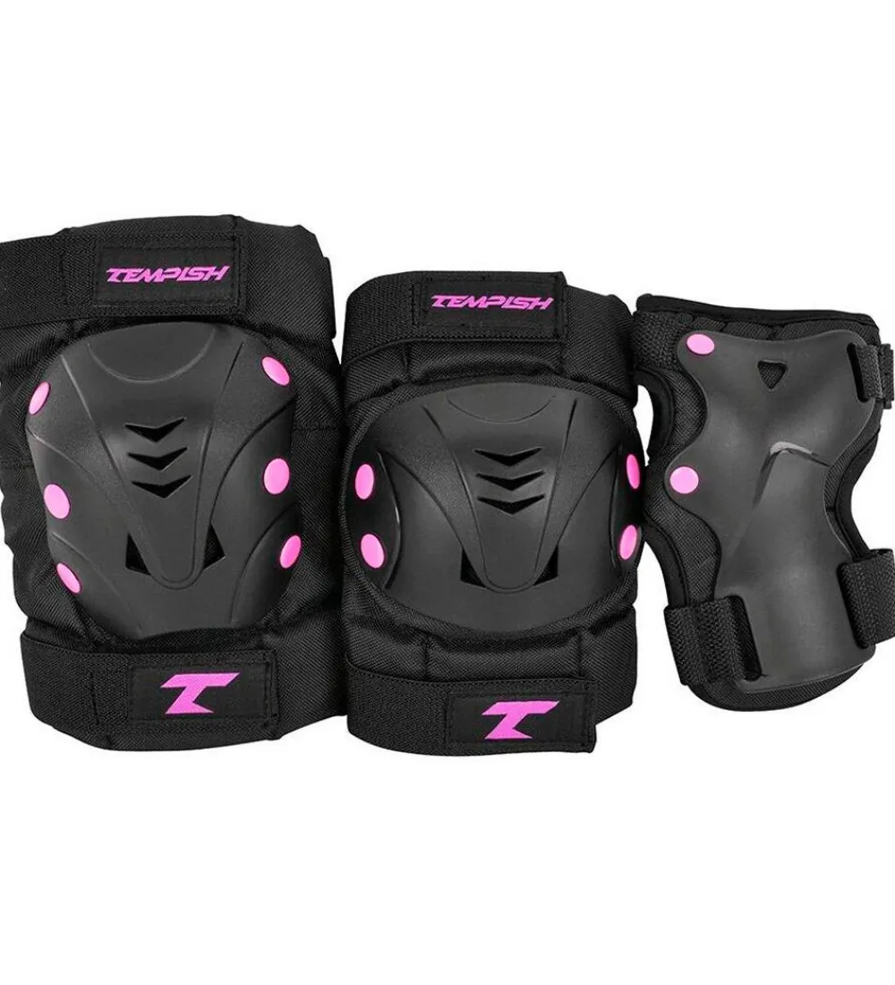 Tempish beskyttelsessættet beskytter de udsatte områder på barnet, når de er ude at stå på rulleskøjter, løbehjul, skateboard eller køre på løbecykel. Beskyttelsessættet spændes fast med gode velcrostropper, så de bliver siddende hvor de skal. Beskyttelsessættet forhindrer ikke nødvendigvis skader, men det afdæmper de slag, som barnets krop kan få, hvis det falder.