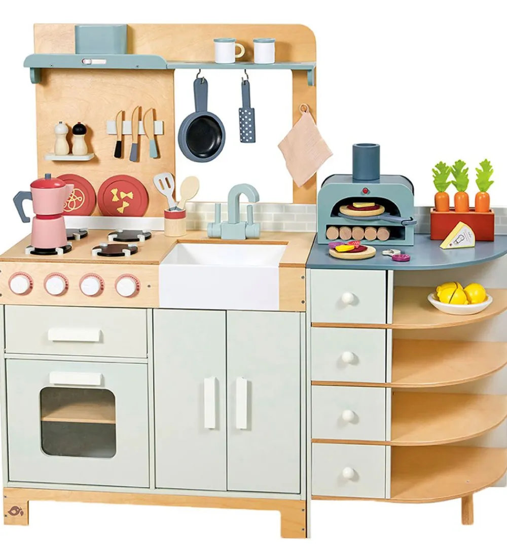 Skønt Tender Leaf legekøkken i naturligt træ, mint, blå og navy.