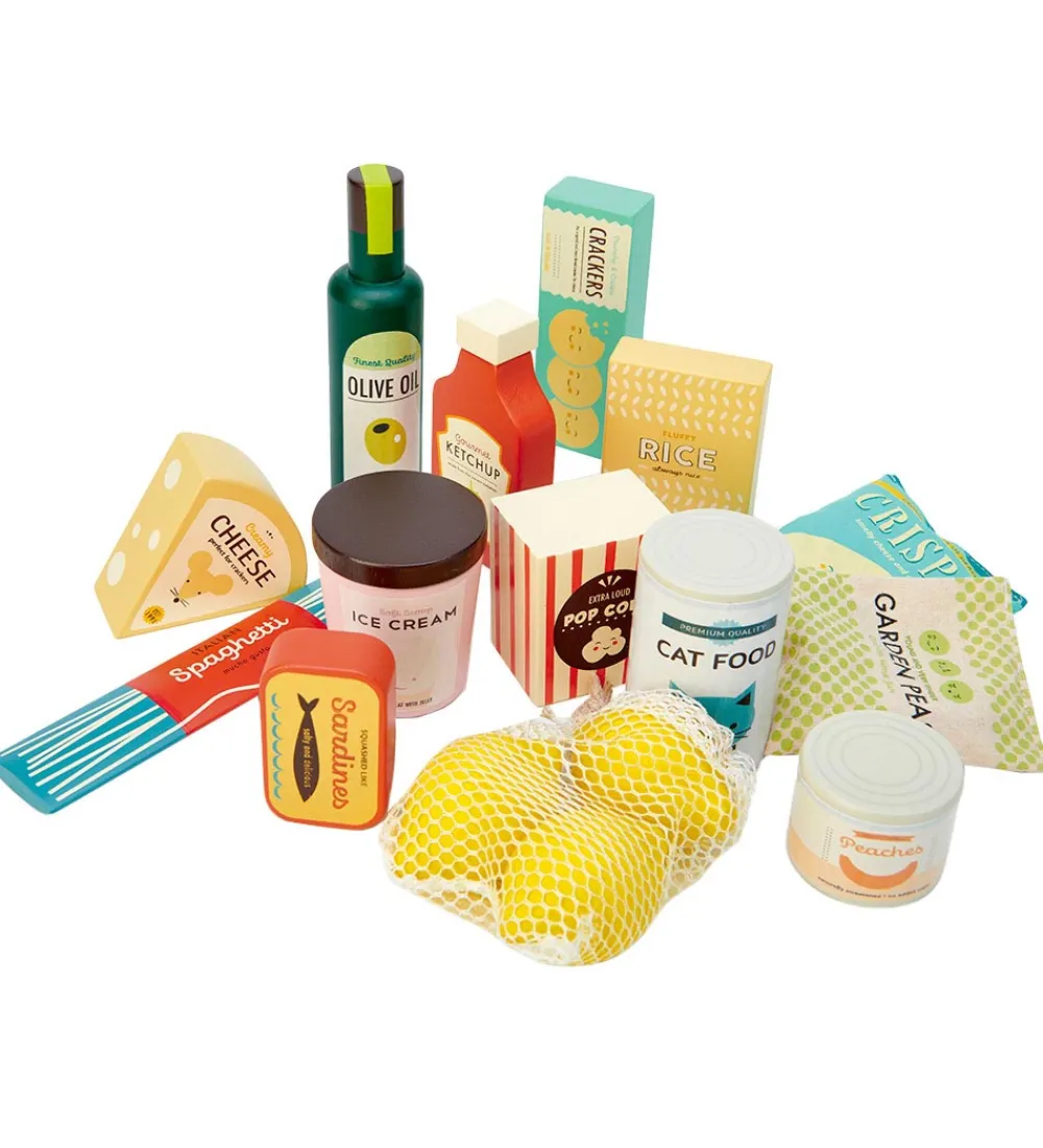 Fint Tender Leaf trælegetøj i naturlig træ og fine farver, som er formet som købmandsvarer med følgende ting: