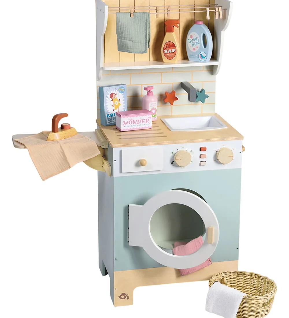 Tender Leaf vaskemaskinen har alt, hvad der skal til for at ordne det beskidte dukketøj. Her er en vaskemaskine, hvor lågen kan åbnes samt en skuffe til vaskepulver. Ovenover er der en håndvask, og allerøverst er der tørresnore til det våde tøj. Når tøjet er tørt, kan det blive strøget fint på klapbordet på siden. Vaskemøblet har mange knapper, man kan dreje og trykke på, og der medfølger en masse forskelligt tilbehør som f.eks. klemmer, en flettet vaskekurv og forskellige flasker og æsker af træ og pap.