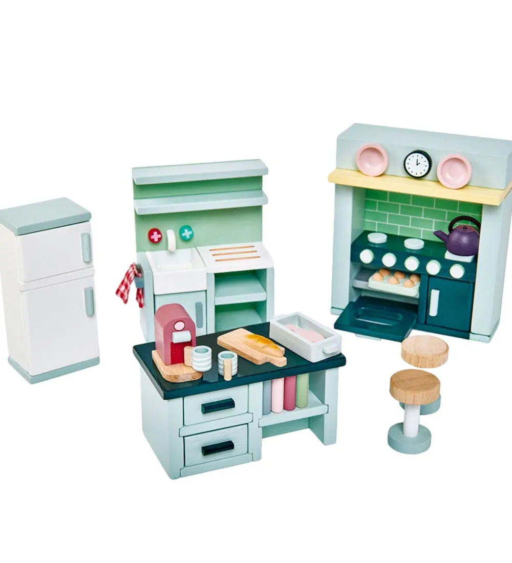 Fint Tender Leaf trælegetøj i naturlig træ og fine farver, som er formet som forskellige møbler til køkkenet med følgende ting: