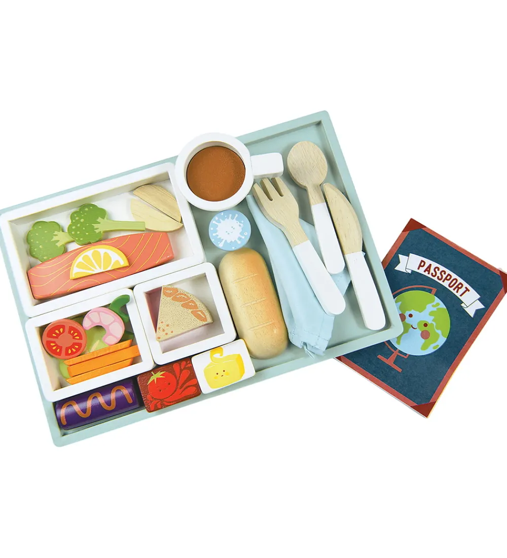 Trælegetøjet indeholder en masse forskelligt mad i små bakker, så man kan lege at man sidder i et fly og får serveret et måltid mad.