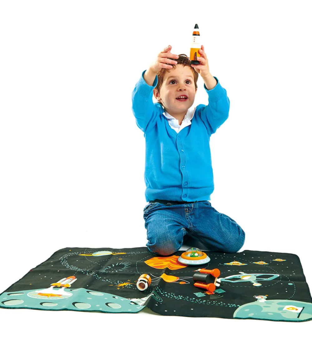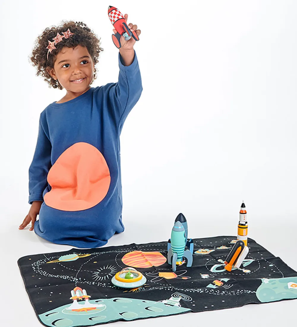 Fantastisk Tender Leaf legetøjssæt bestående af en mørk stofmåtte med et detaljeret rumprint. Tender Leaf legetøjet har raketter og ufoer, der skaber en spændende, rumrejse-inspireret oplevelse for de små opdagelsesrejsende.