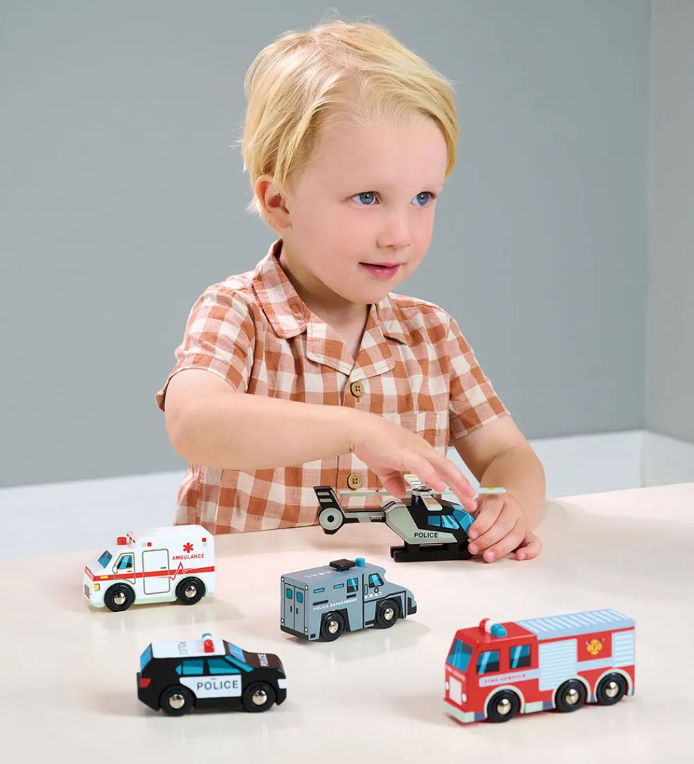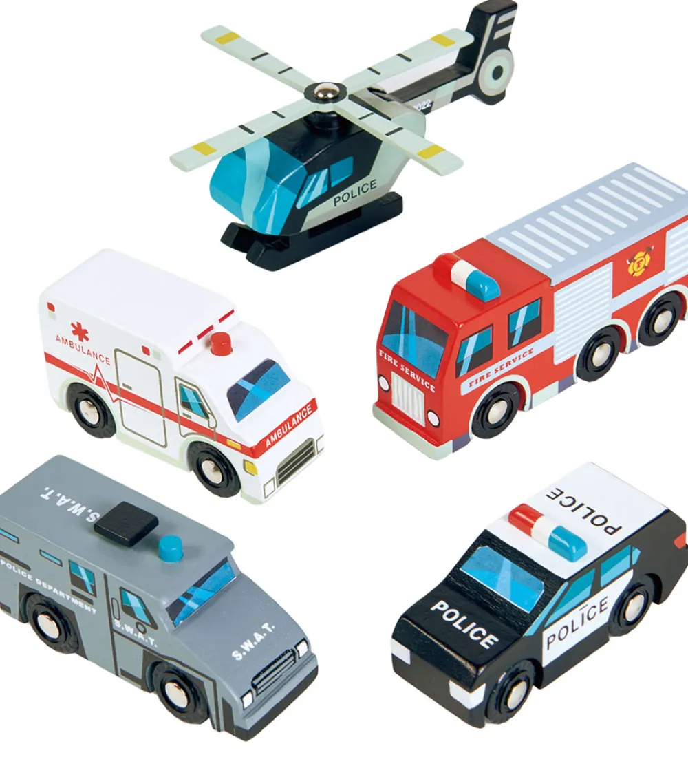 Sjovt Tender Leaf trælegetøj formet som fem forskellige udrykningskøretøjer.