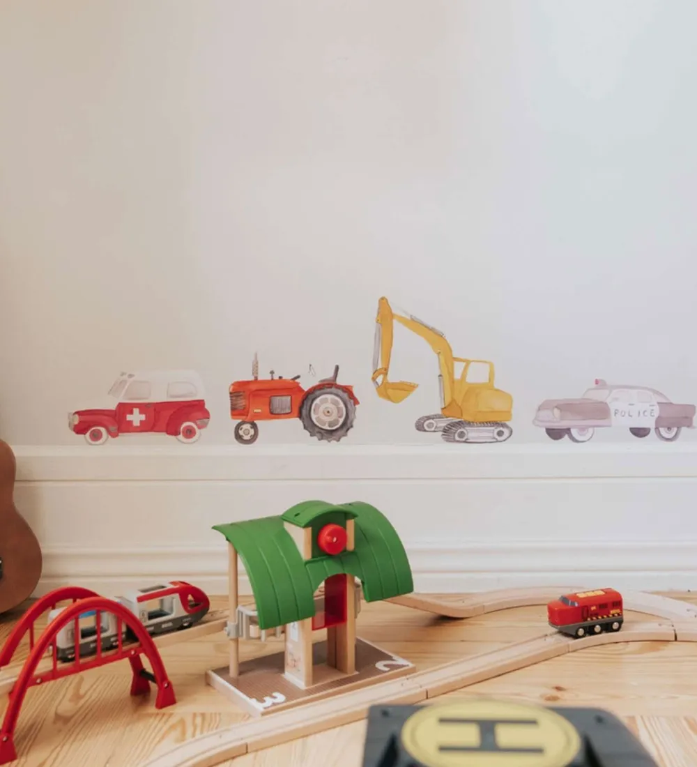 Fantastiske Thats Mine wallstickers med detaljerede motiver af køretøjer i farver som rød, sort og gul. Thats Mine wallstickersne giver liv til væggene med politi- og ambulancebiler samt traktor og gravko. Wallstickersene er flytbare, så kun fantasien sætter grænser.