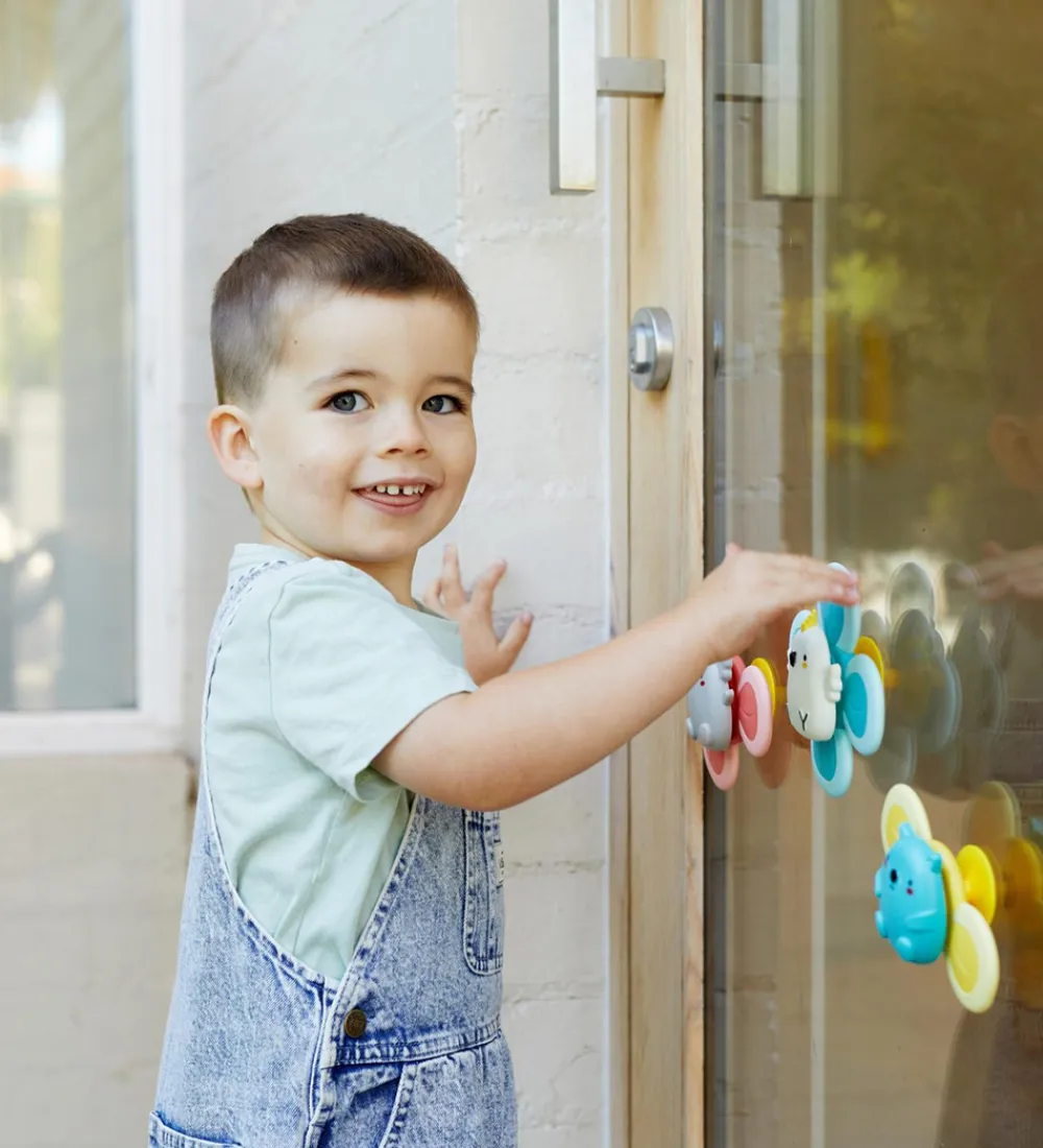 Tiger Tribe aktivitetslegetøjet sættes nemt fast på glatte over, f.eks. badeværelsesfliser, børnebordet eller bilruden, ved hjælp af en sugekop bagpå. Når den er sat op, kan spinneren drejes rundt, mens dyret siger en raslende lyd.
