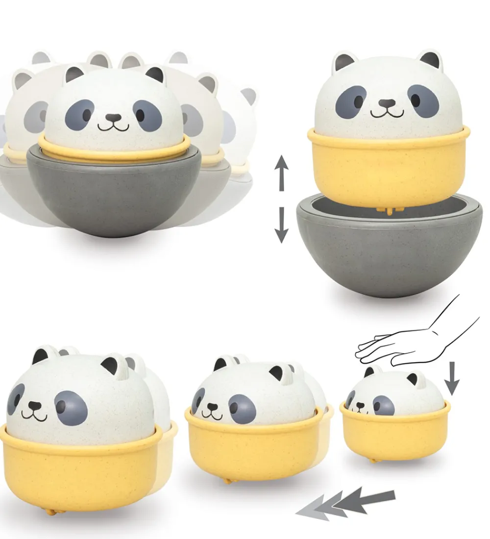 Sjovt Tiger Tribe legetøj i form af en skøn panda, der både er et vippe-legetøj og en sej panda-racer. Når pandaen er ude af skålen, trykker man ned på dens hoved, og så ræser den hen over gulvet på sine små hjul.