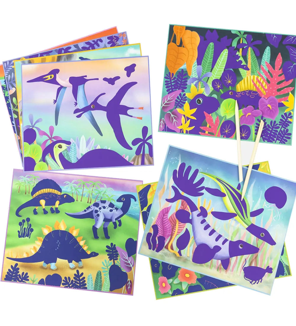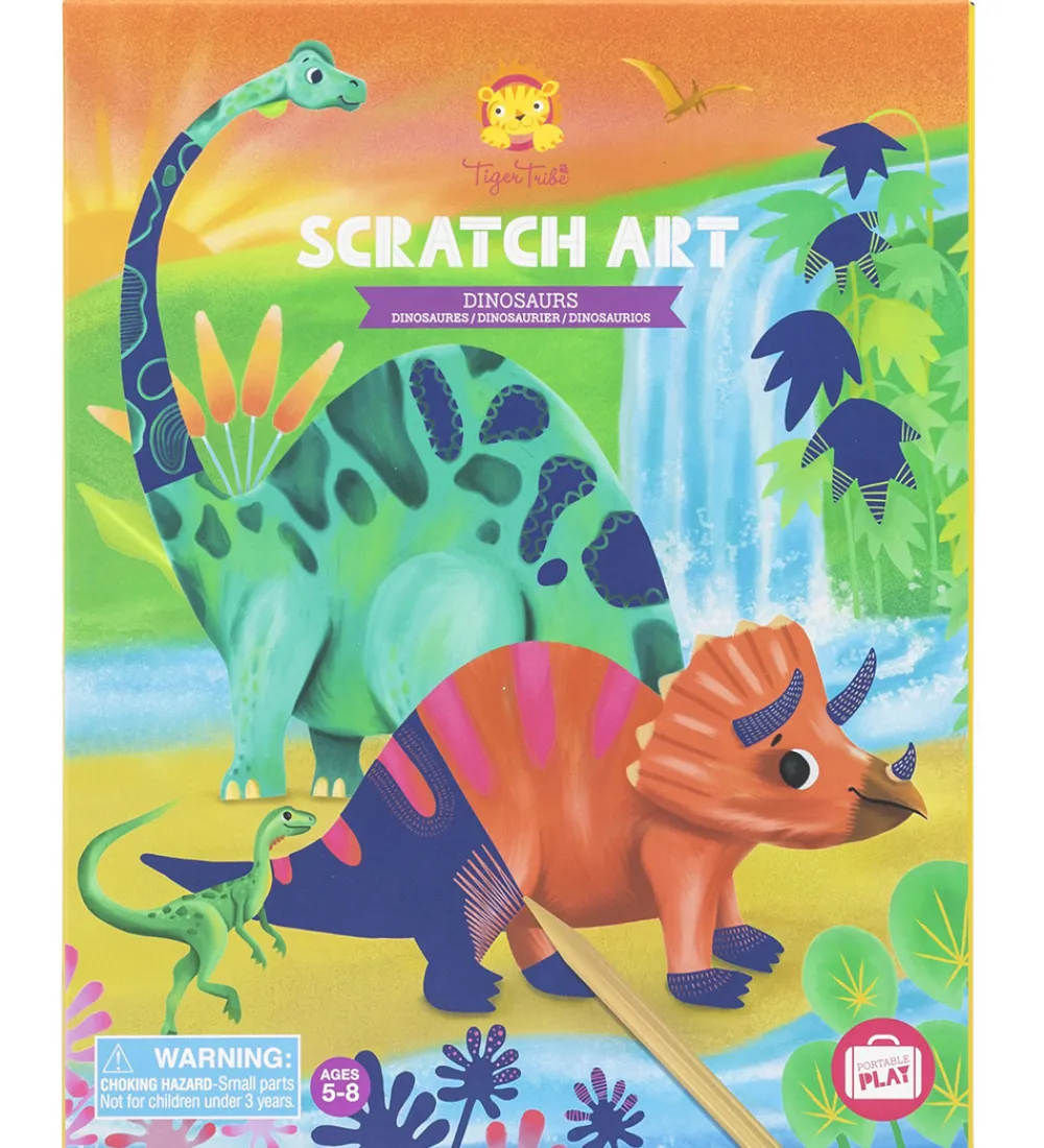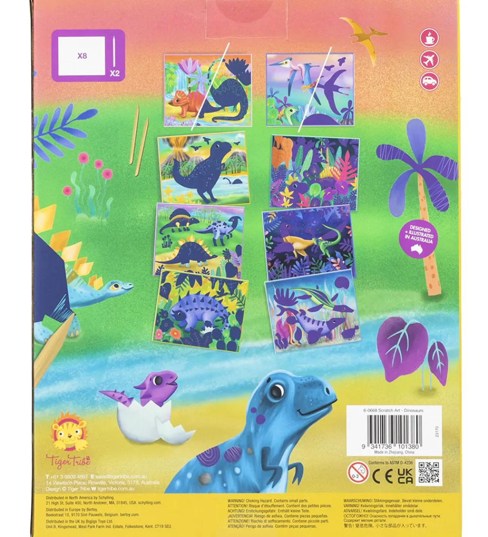 Sjove Tiger Tribe skrabekort med forskellige, flotte motiver af dinosaurer. Sættet indeholder 8 skrabekort og 2 skraberedskaber.