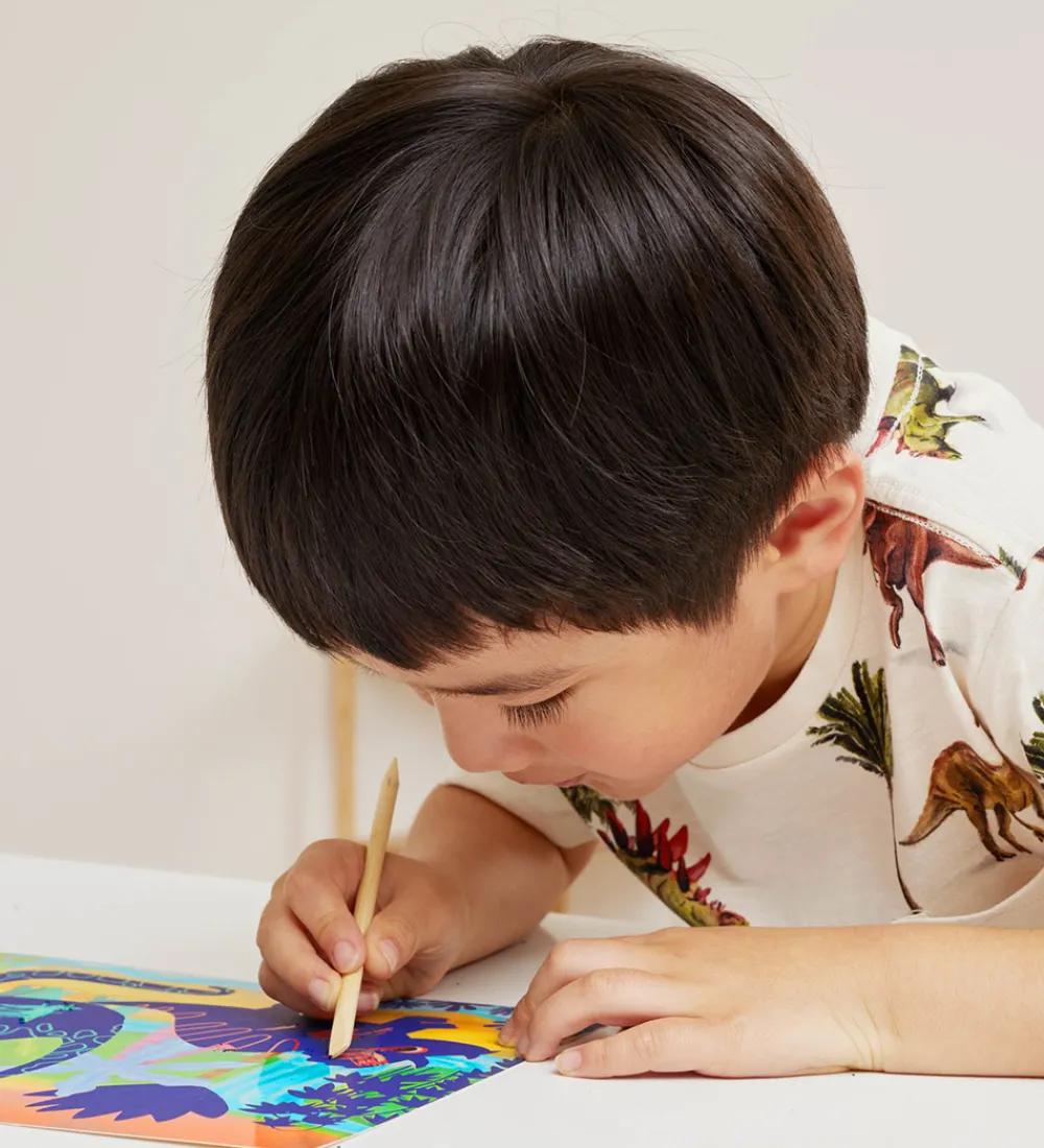 Tiger Tribe skrabekortene er mørke med optegnede motiver, og når barnet skraber på dem med pennen, dukker der forskellige flotte farver og mønstre frem, så motiverne bliver farvelagt.