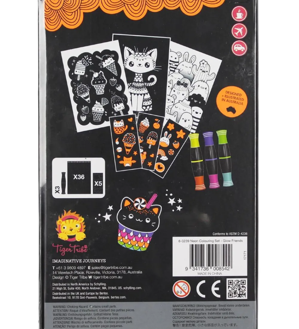 Tiger Tribe malesættet består af en praktisk opbevaringsæske som indeholder et hæfte med 36 sider med motiver, der kan farvelægges, 3 tuscher med 6 forskellige neon farver og 5 ark fyldt med flotte klistermærker.
