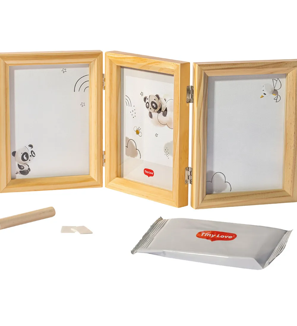 Smart Tiny Love aftryksæt med en triple billedramme i træ. Tiny Love sættet indeholder alt, der skal bruges til at lave et hånd- og fodaftryk af din baby. Med sættet kan du forevige minder af din baby, og med den medfølgende billedramme kan du lade aftrykket stå til pynt i hjemmet eller bruge det som en personlig gave.