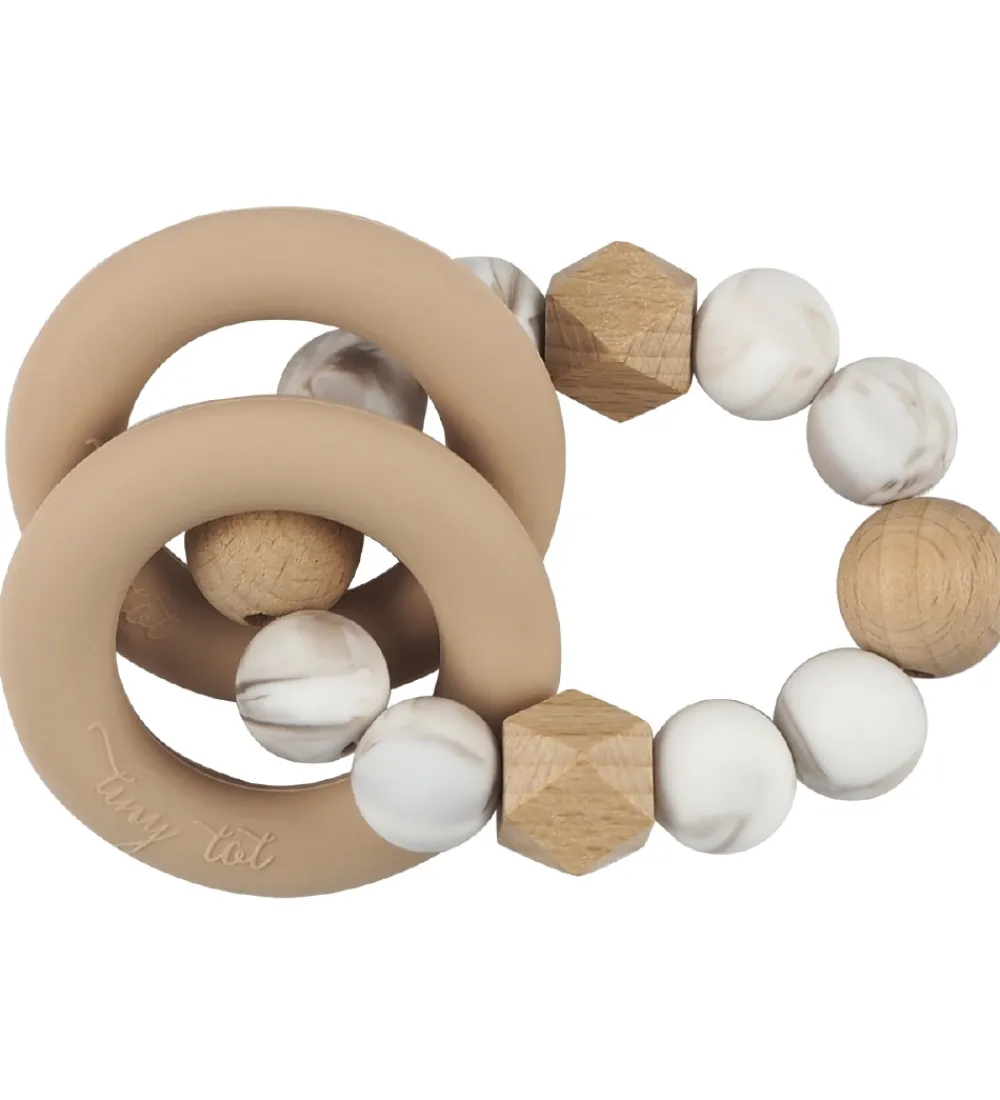 Tiny Tot bideranglen består af en stor ring, og omkring ringen er der to mindre ringe i brun, som babyen kan bide i hvis gummerne klør.