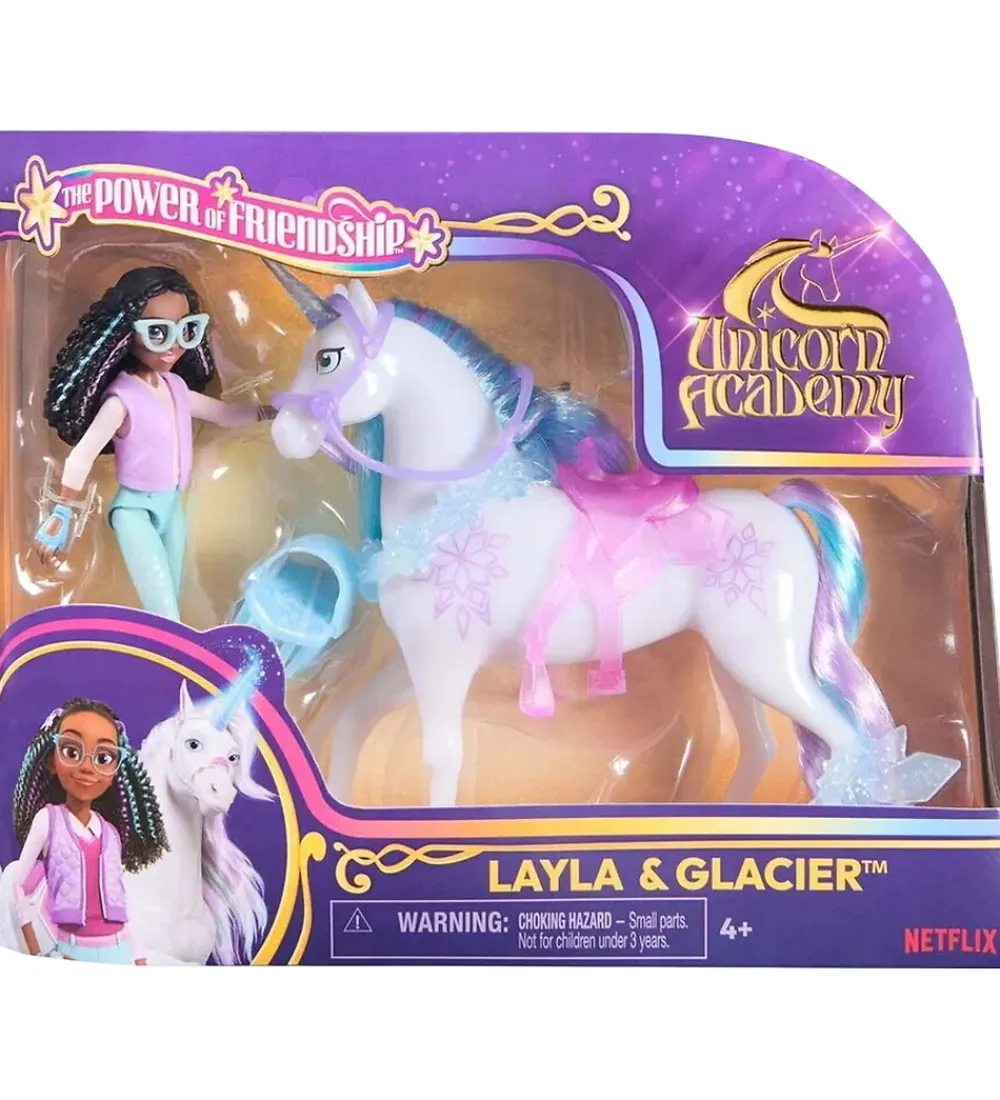 Flotte Unicorn Academy legetøjsfigurer, som forestiller Layla og hendes enhjørning Glacier – kendt fra Netflix-serien “Unicorn Academy”.