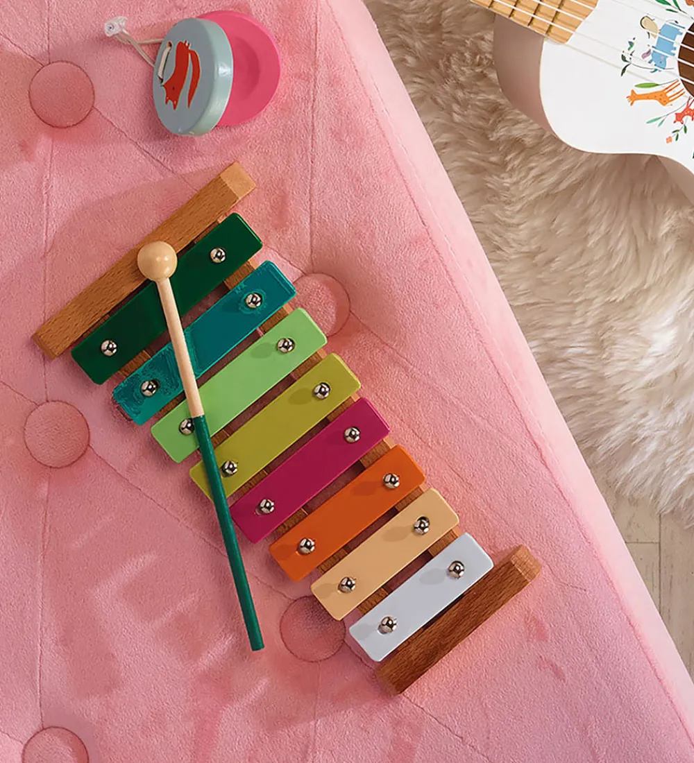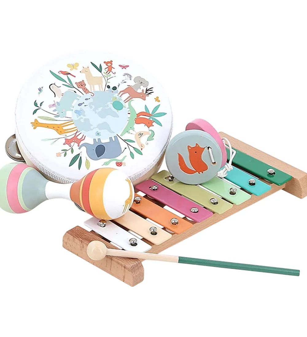 Flotte Vilac musikinstrumenter med farverige detaljer. Sættet inkluderer et xylofon, en tamburin, maracas og kastagnetter. Musikinstrumenterne har fine dyremotiver og kan bruges til at spille alverdens melodier på.