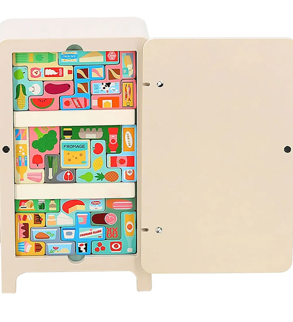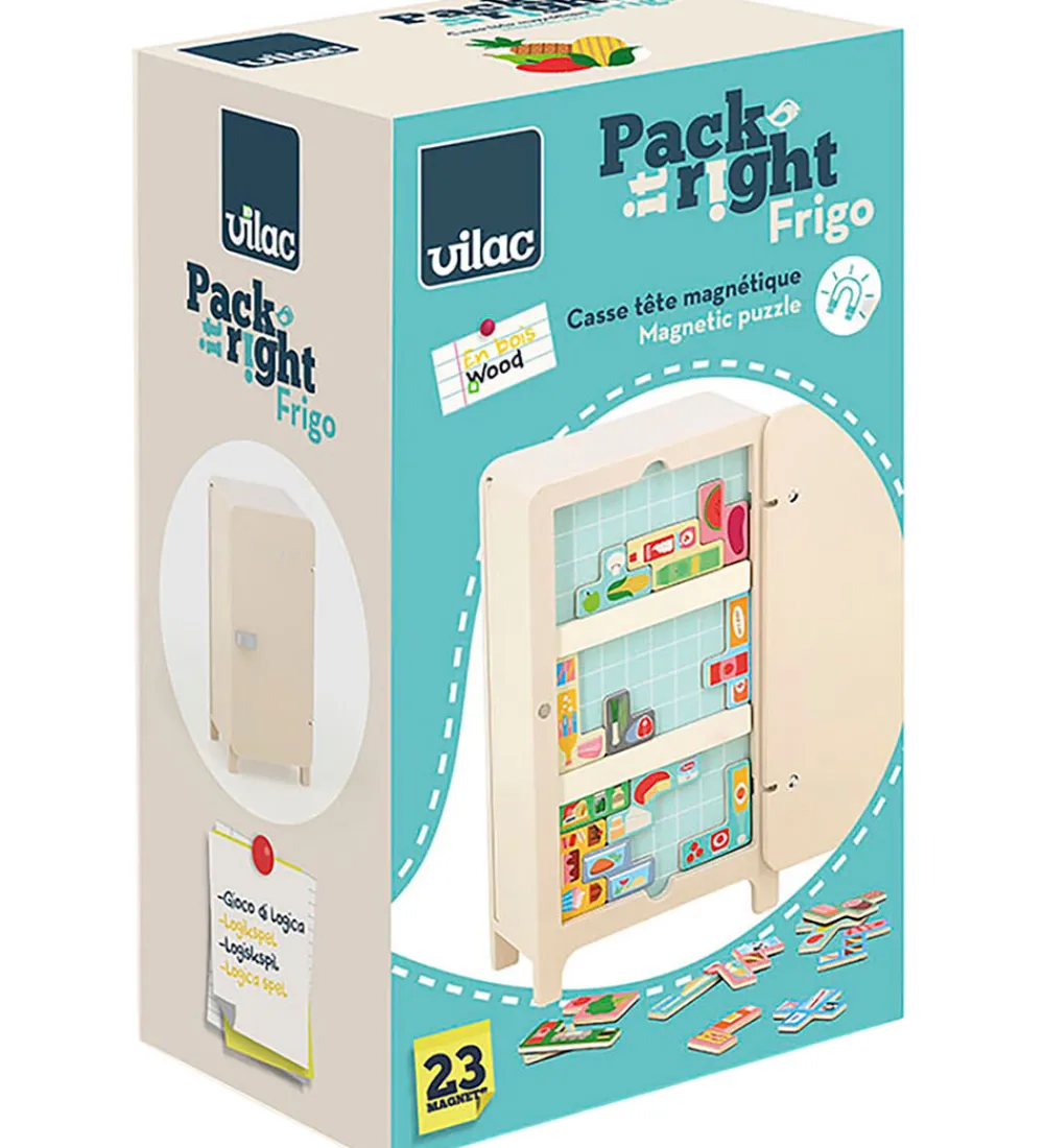 Flot Vilac logikspil i træ med farverigt madprint. Vilac spillet er formet som et køleskab. De 23 brikker er magnetiske og pyntet med mad motiver.