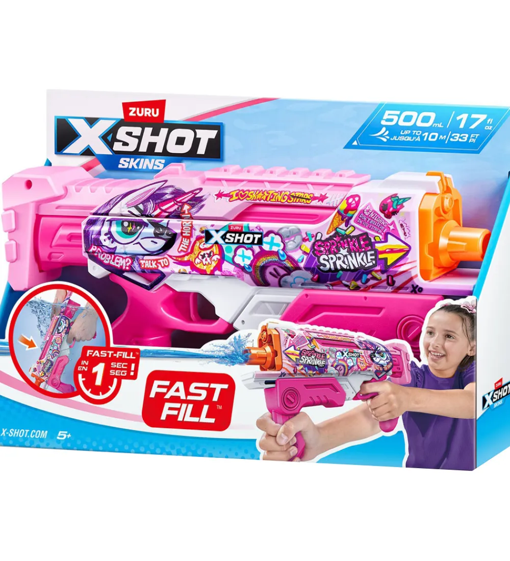 X-SHOT vandpistolen er perfekt til hæsblæsende og afkølende vandkamp, da den har Fast Fill-funktion, så den kan blive fyldt med vand på 1 sekund. Vandpistolen sprøjter vand op til 10 meter.