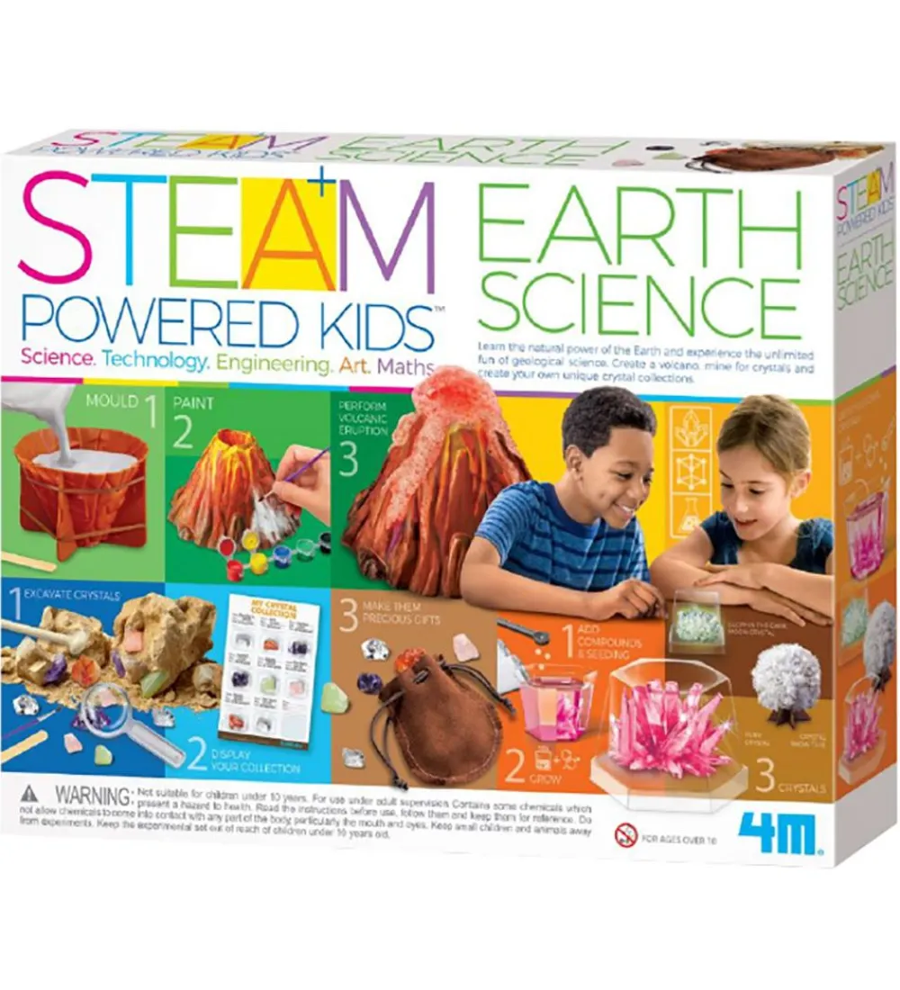4M videnskabssættet er sjovt til de lidt større børn, som forener leg, viden og læring i ét. Børnene kan bygge og dekorarere en vulkan, grave krystaller frem og fremstille sine egne krystaller. Sættet byder på mange timers sjov og leg.
