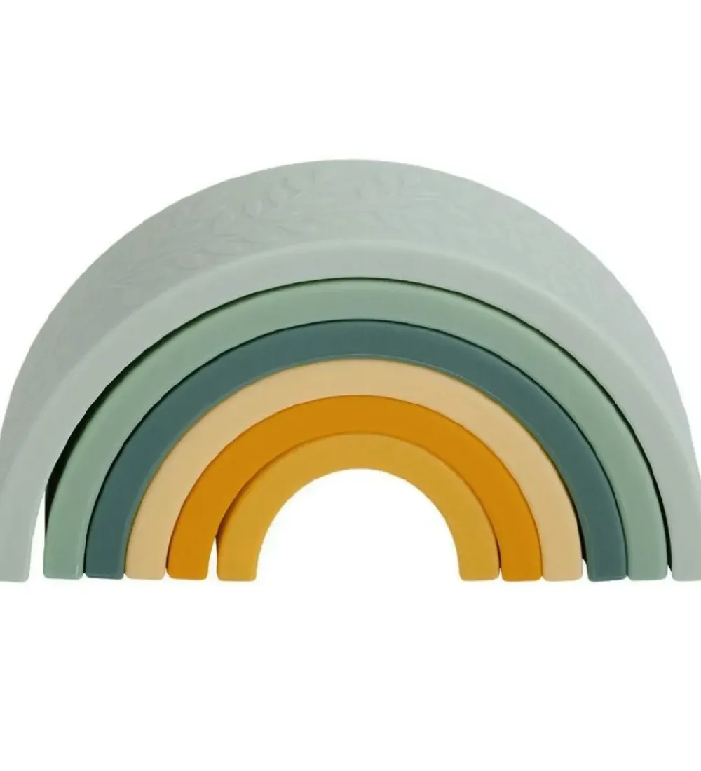Sjovt A Little Lovely Company stablelegetøj, bestående af seks dele af en regnbue i forskellige farver. Den yderste del har blade i materialet.