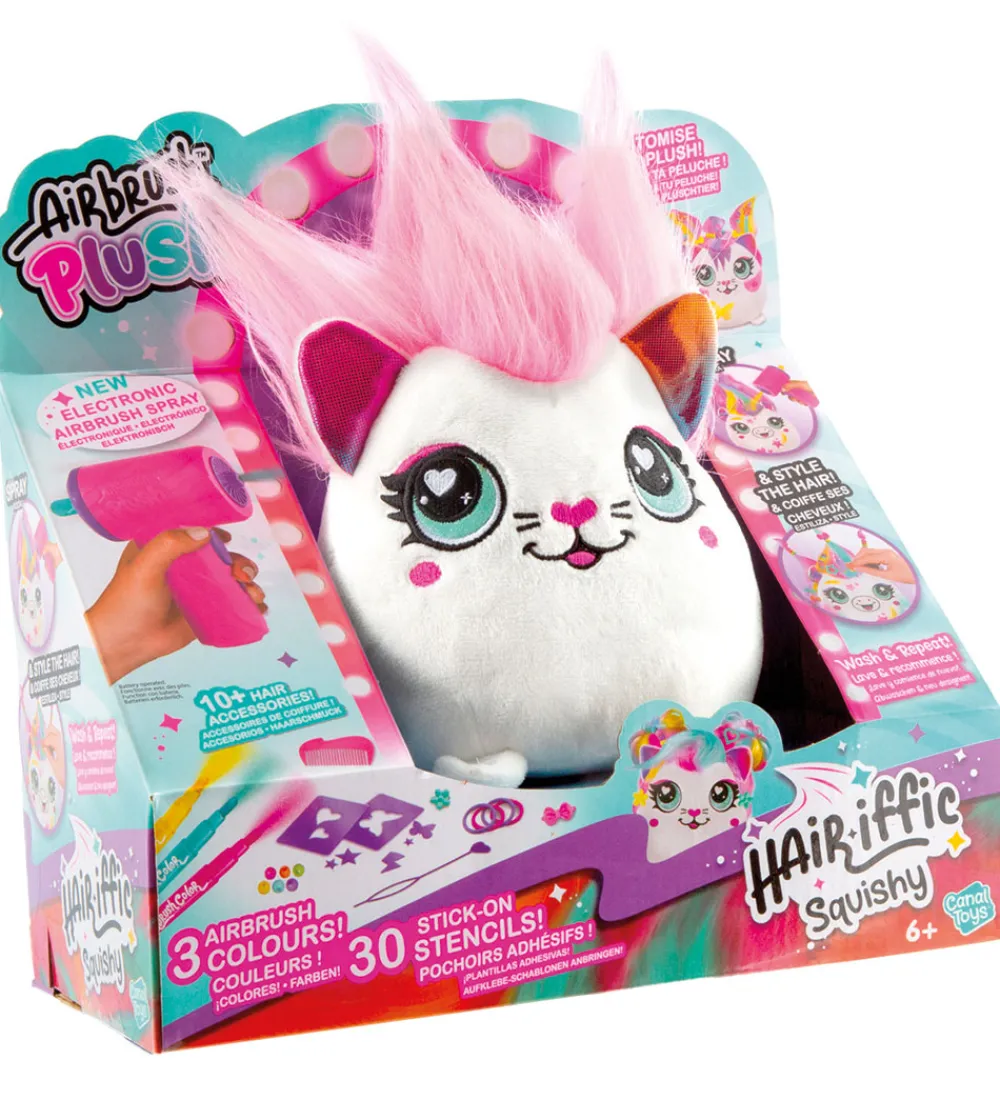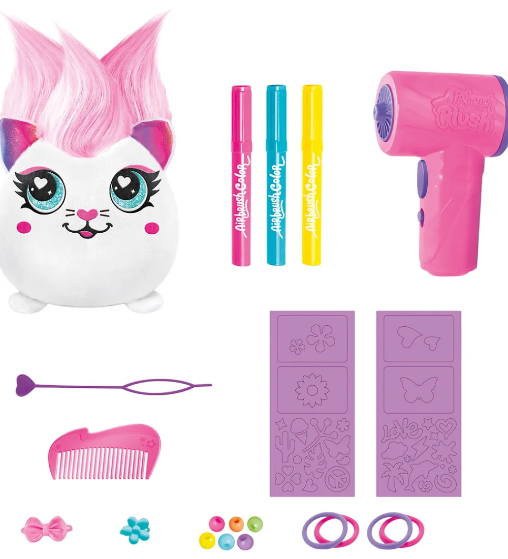 Airbrush Plush bamsen er blød, sød og nuttet, og du kan selv farvelægge den med de medfølgende 3 airbrush-farver og 30 genanvendelige skabeloner. Så kan du airbrushe bamsen i et utal af smukkes designs. Airbrush-farverne vaskes nemlig nemt af igen. Der medfølger også en masse tilbehør, så du kan style bamsens flotte hår.