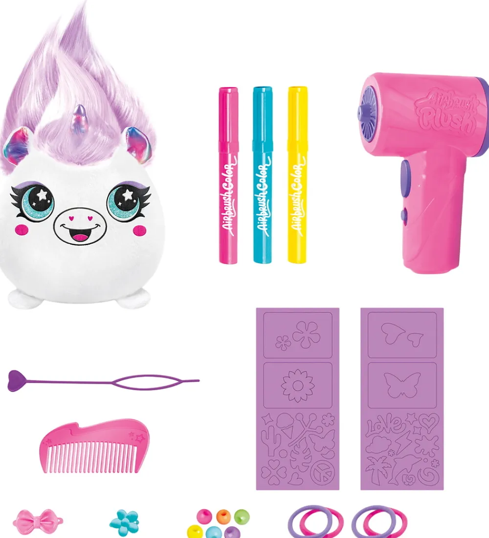 Airbrush Plush bamsen er blød, sød og nuttet, og du kan selv farvelægge den med de medfølgende 3 airbrush-farver og 30 genanvendelige skabeloner. Så kan du airbrushe bamsen i et utal af smukkes designs. Airbrush-farverne vaskes nemlig nemt af igen. Der medfølger også en masse tilbehør, så du kan style bamsens flotte hår.
