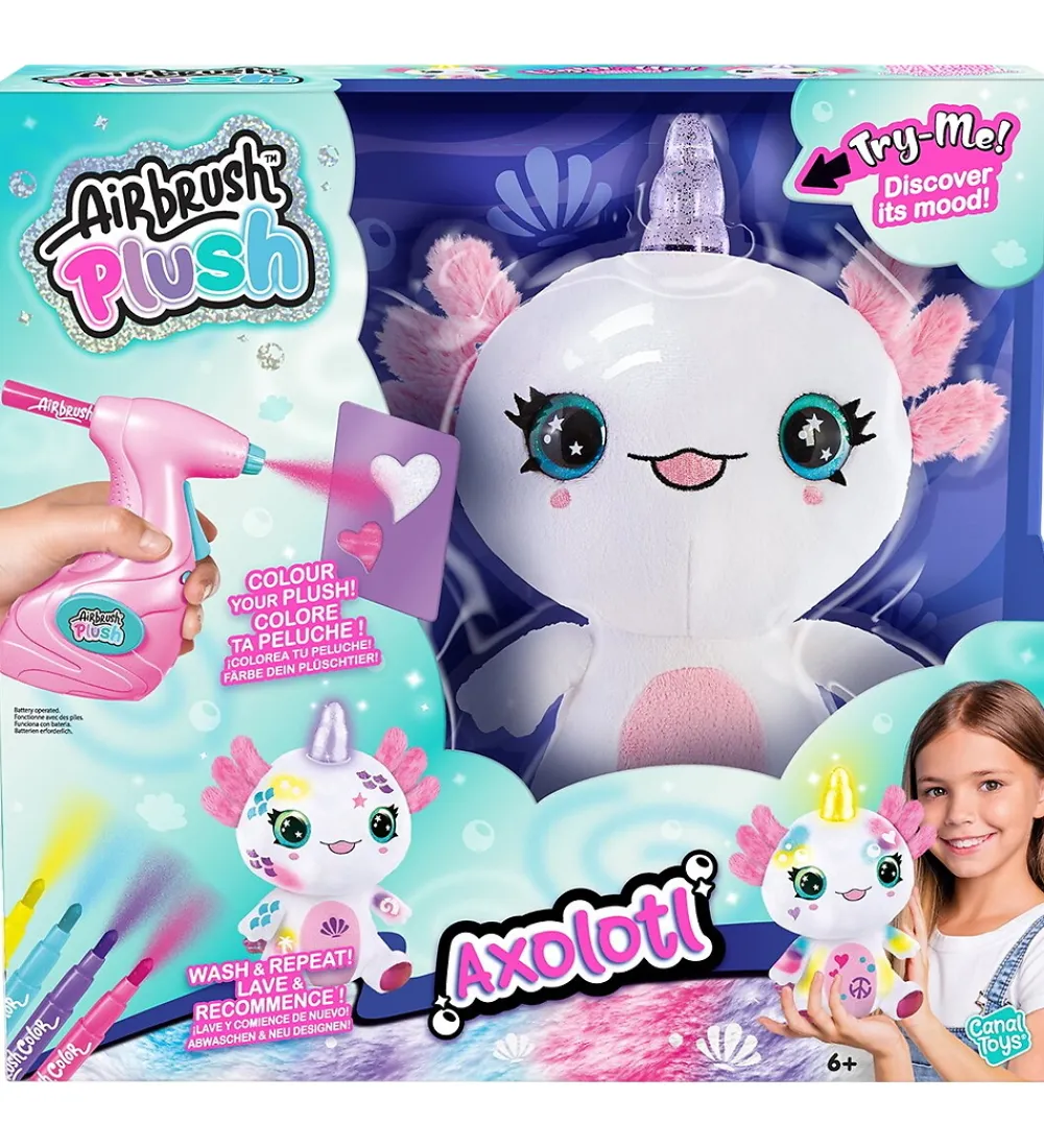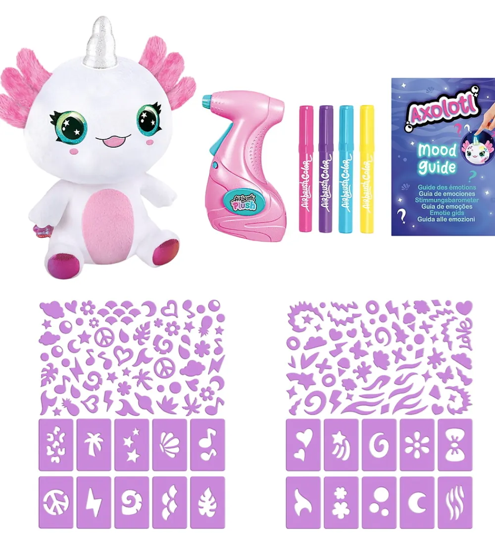 Airbrush Plush bamsen er blød, sød og nuttet, og du kan selv farvelægge den med de medfølgende 4 airbrush-farver samt mere end 100 genanvendelige skabeloner. Så kan du airbrushe bamsen i et utal af smukkes designs. Airbrush-farverne vaskes nemlig nemt af igen.
