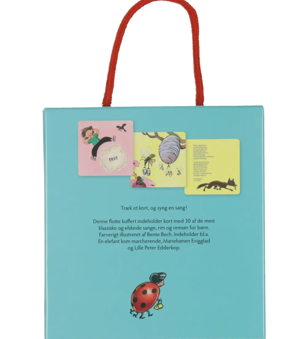 Alvilda kortene byder på hyggelige illustrationer, der fanger opmærksomheden hos de mindste. Kufferten indeholder 30 af de mest klassiske og elskede sange, rim og remser for børn, som bl.a. “En elefant kom marcherende”, “Mariehønen Evigglad” og “Lille Peter Edderkop”.