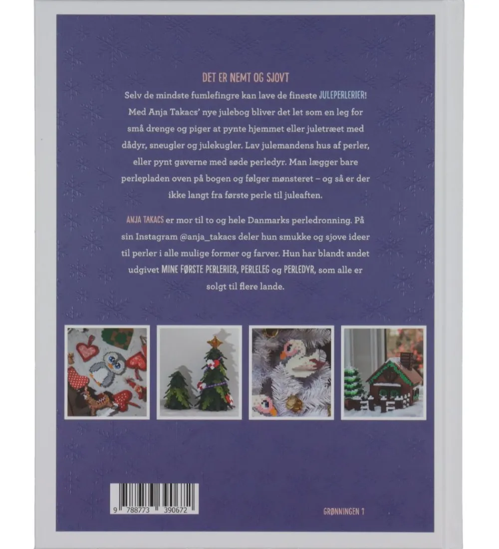 Anja Takacs bogen “Mine Første Juleperlerier” indeholder nytænkende, sjove og inspirerende ideer til brugen af perler- og perlepladerne. Bogen indeholder motiver til juletiden som f.eks. nissedør, Julemandens Hus, juletræspynt og meget mere.