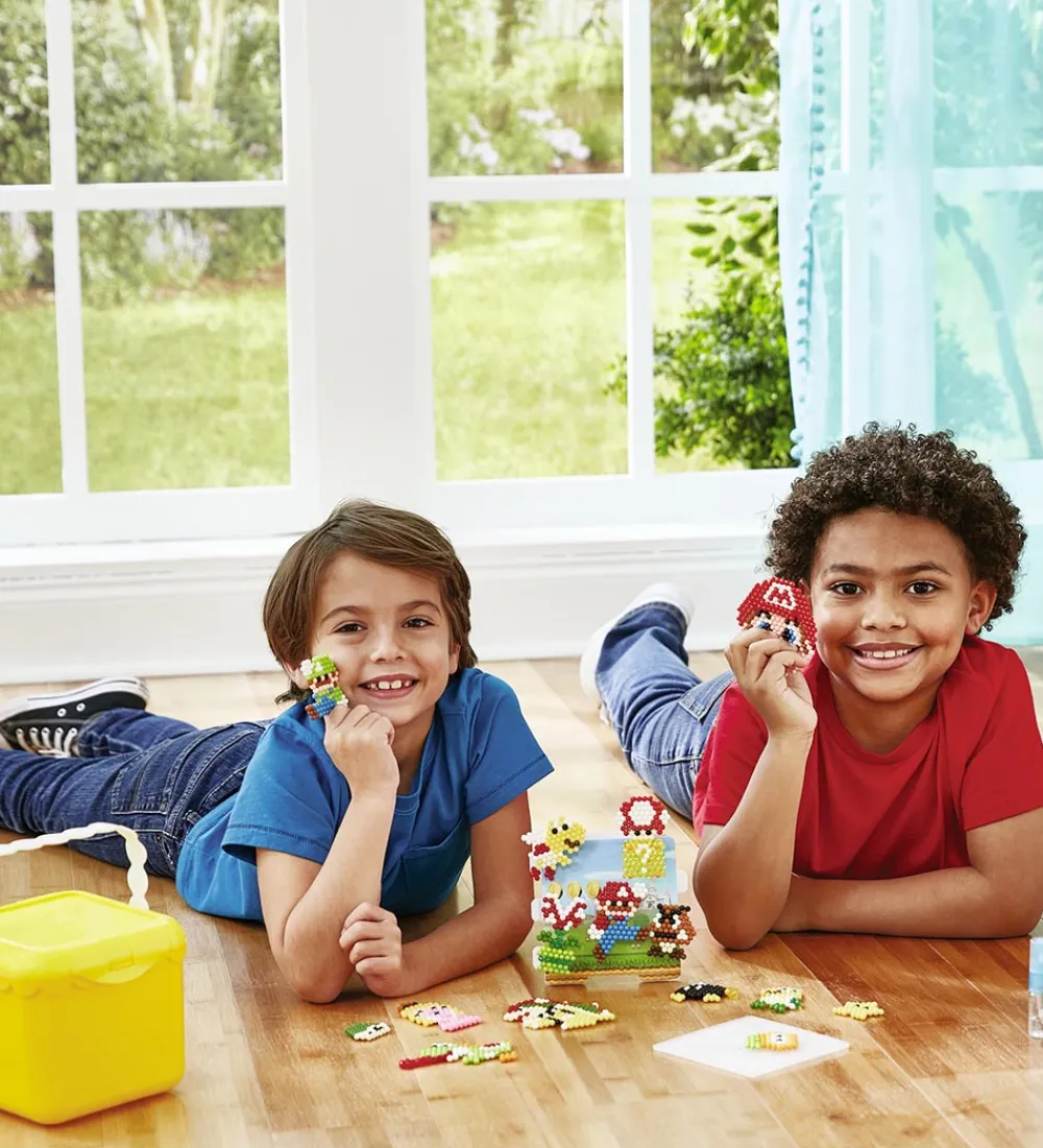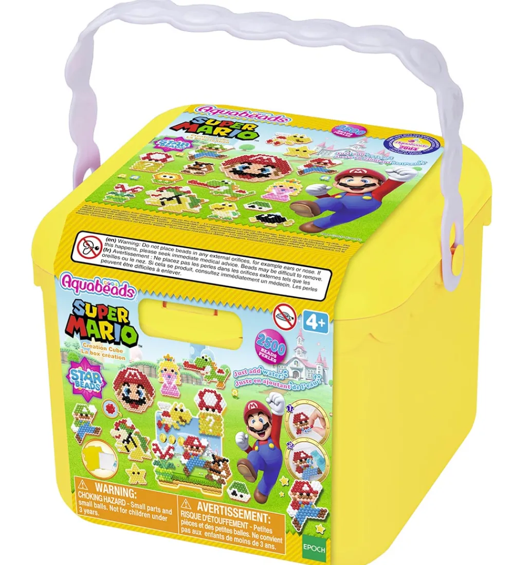 Sjovt Aquabeads perlesæt i en Super Mario-temaudgave. Sættet kommer i en gul plastæske med låg og bærehank, og den indeholder over 2500 runde, sekskantede og stjerneformede perler i forskellige farver samt 1 perleplade, 1 kreationsdekorationsplade, 1 vandsprøjte og motivskabeloner.
