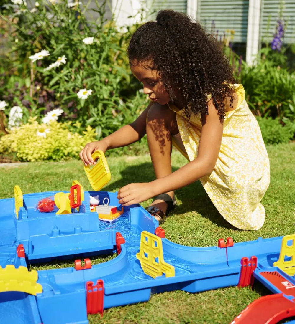 AquaPlay legesættet er beregnet til sjov med vand, hvor alle kan være med. Børnene kan ved hjælp af håndsving, broer, pumper og sluse finde på masser af sjove ting at gøre med vandet. Vandkanalen har brede vandveje og ved at dreje håndsvinget kan bådene sejle rundt. Sættet stimulerer børnenes kreativitet og fantasi.