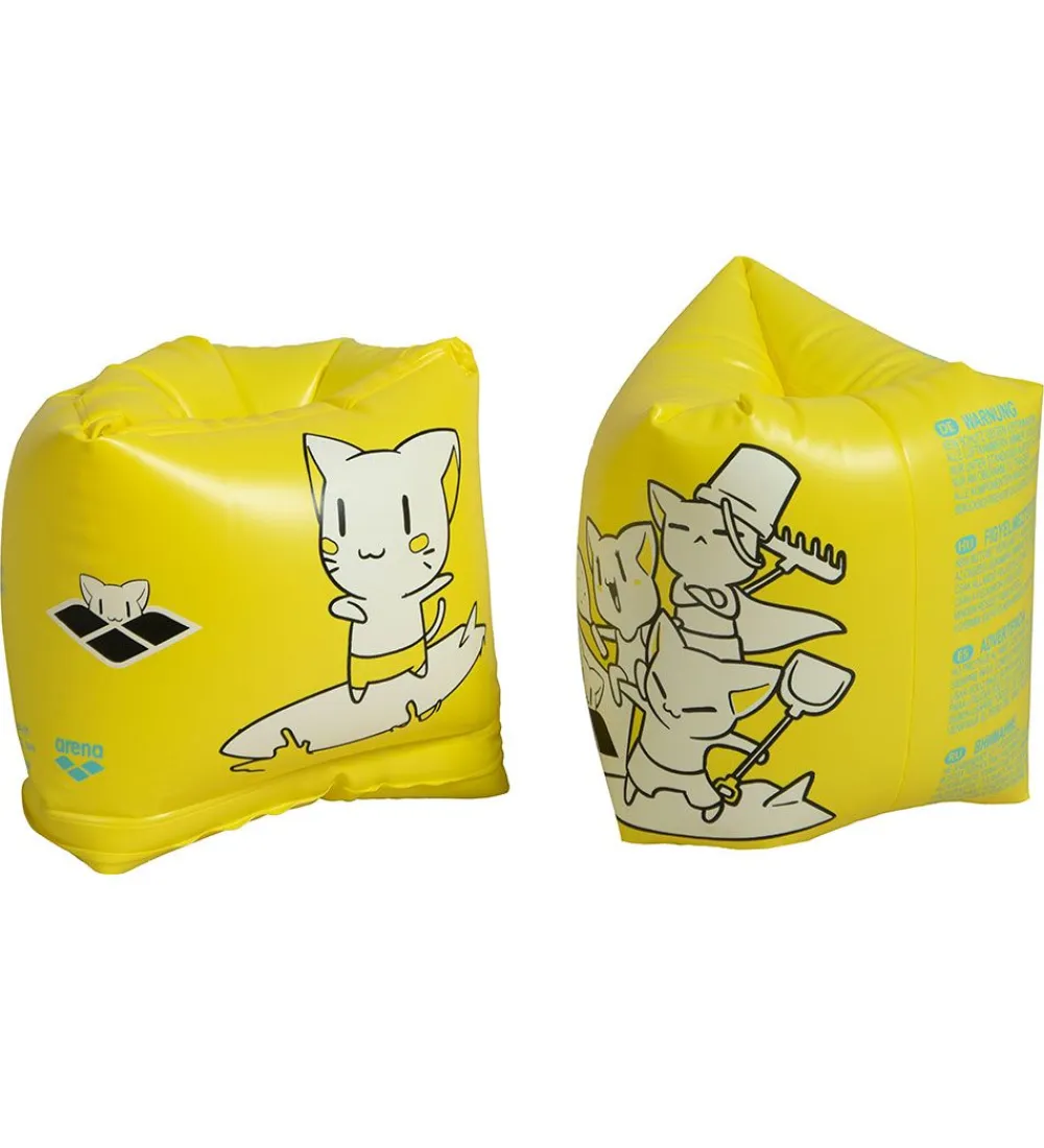 Seje Arena badevinger i gul med et flot, hvidt print af katte på stranden.