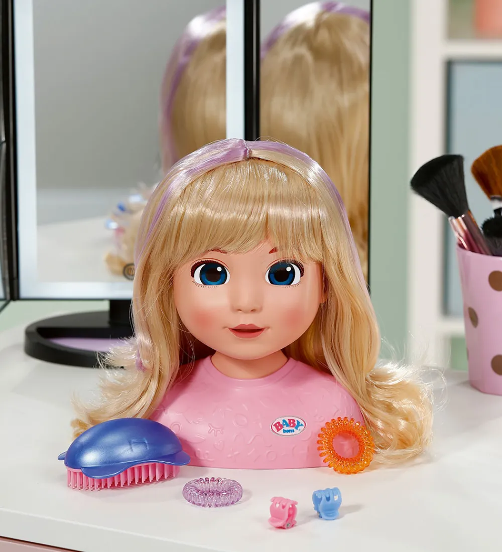 Charmerende BABY Born dukkehoved med langt, lyst hår og masser af medfølgende tilbehør. Baby Born dukkehovedet er pefekt til de kreative små, som elsker at lege stylist og sætte hår i flotte frisurer.