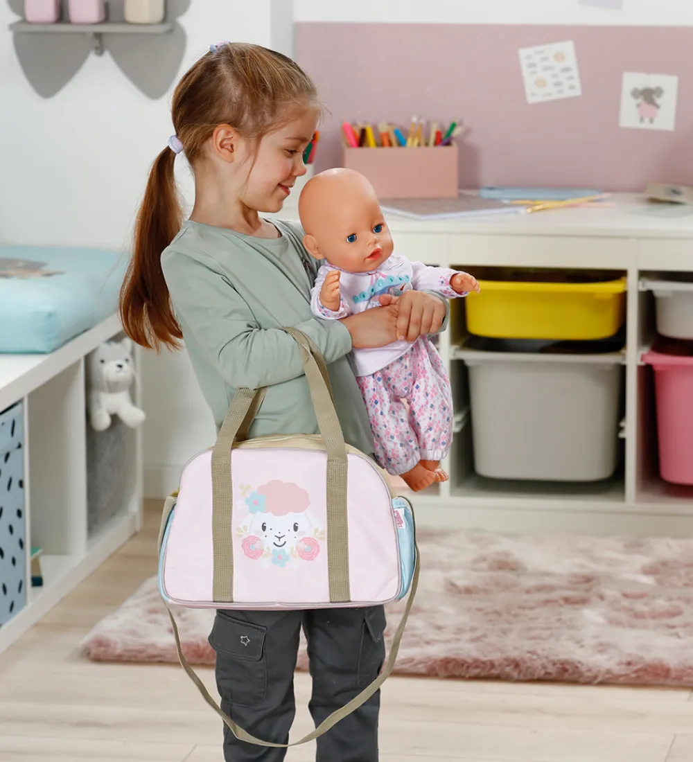 Charmerende BABY born dukketilbehør med en flot dukkepusletaske i et blomstret tema. Tasken har et sødt print af et får og praktiske lommer i lyseblå og brun. Matcher perfekt med det medfølgende farverige pusleunderlag samt tilbehøret i form af en ble og babypudder.