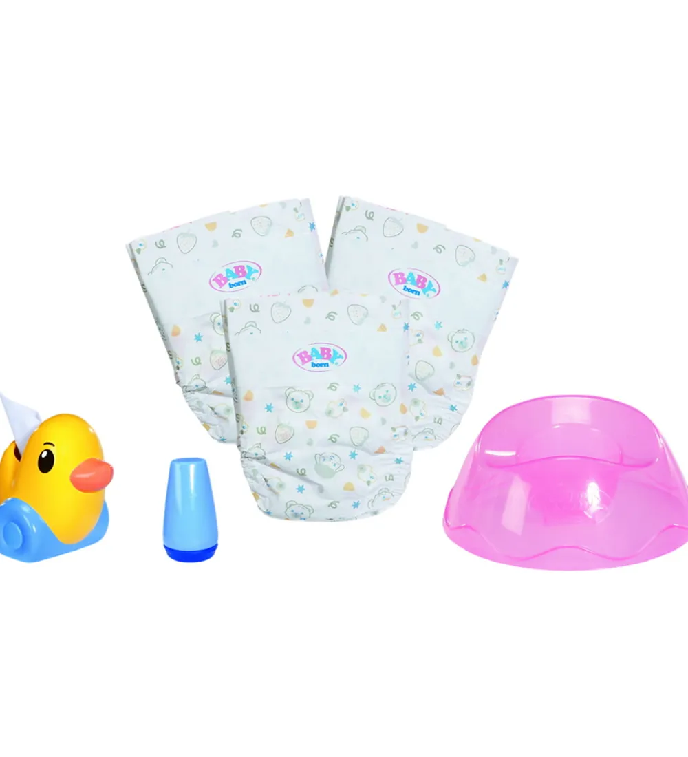 Praktisk BABY born dukketilbehør, der inkluderer en lyserød potte, tre bleer med sjove motiver samt en lille gul and. BABY born sættet tilbyder alsidigt udstyr til enhver dukkeplejesituation.