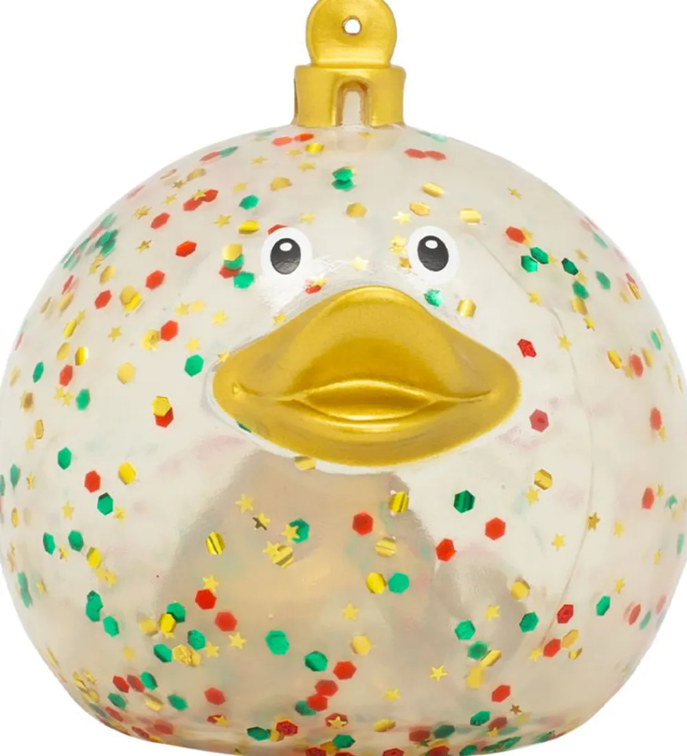 Festlig badeand som ligner en julekugle med multifarvet glimmer.