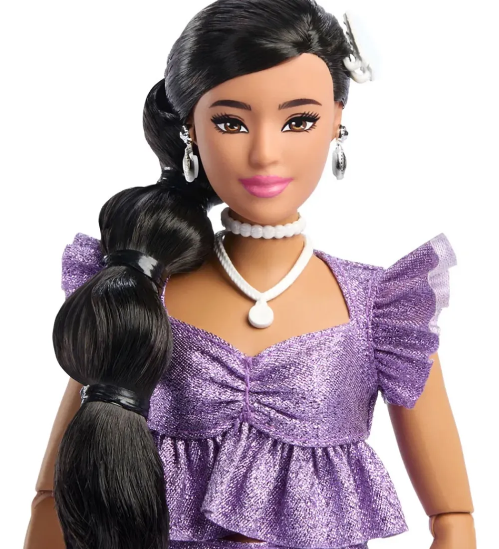Skøn Barbie dukke iført et strålende sæt i lilla med glimmer, sættet består af en top med flæseærmer og shorts. Barbie dukken bærer smykker og holder en fin lilla taske, der fuldender det stilfulde look.