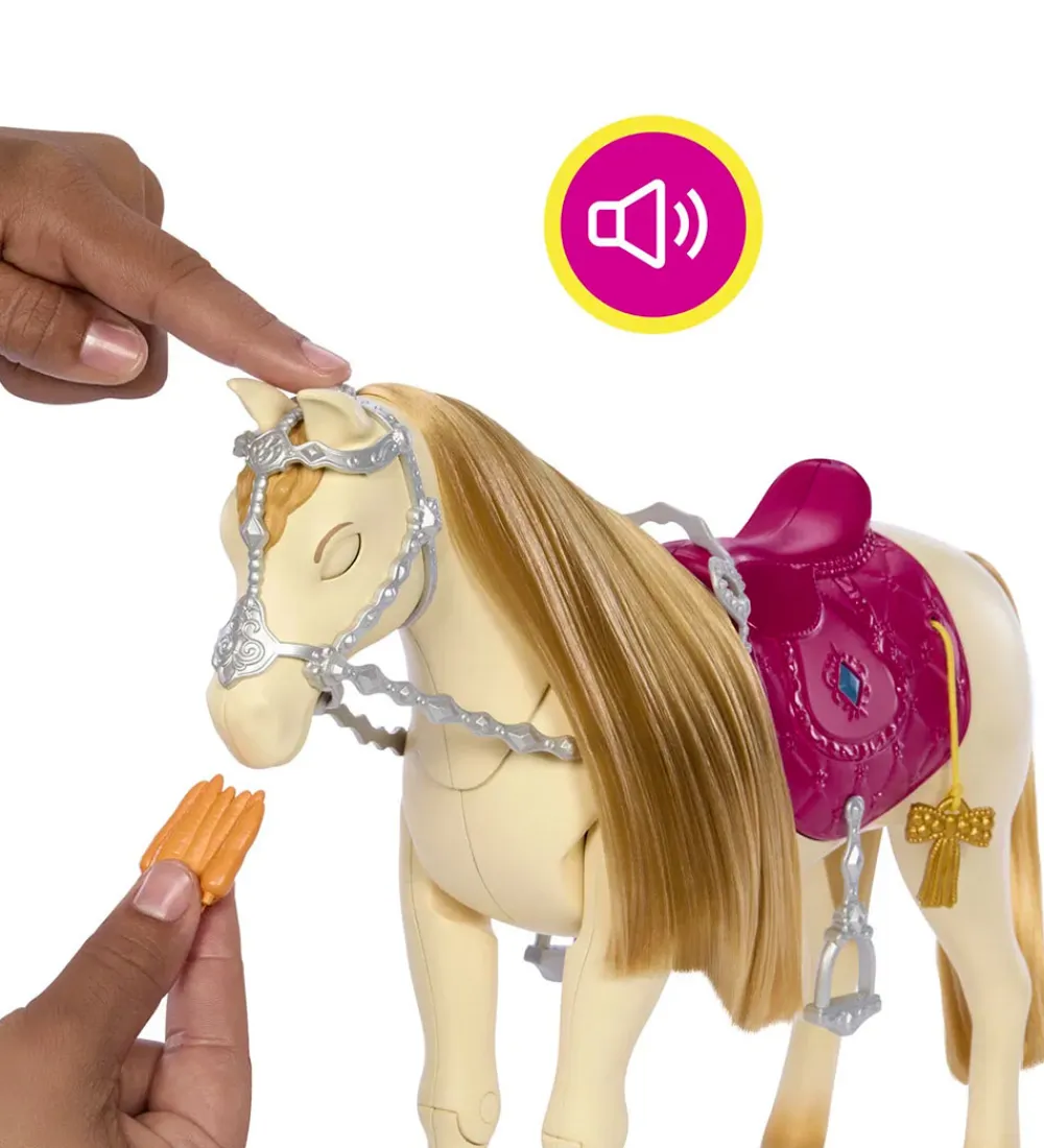 Barbie sættet inkluderer den yndige hest og tilbehør som fodringsskål, hårbørste og flere redskaber til pleje af hesten. Udover det flotte tilbehør kan hesten sige over 20 lyde og bukke og nege. Hesten inspirere børnene til at skabe deres egne historier og lege.