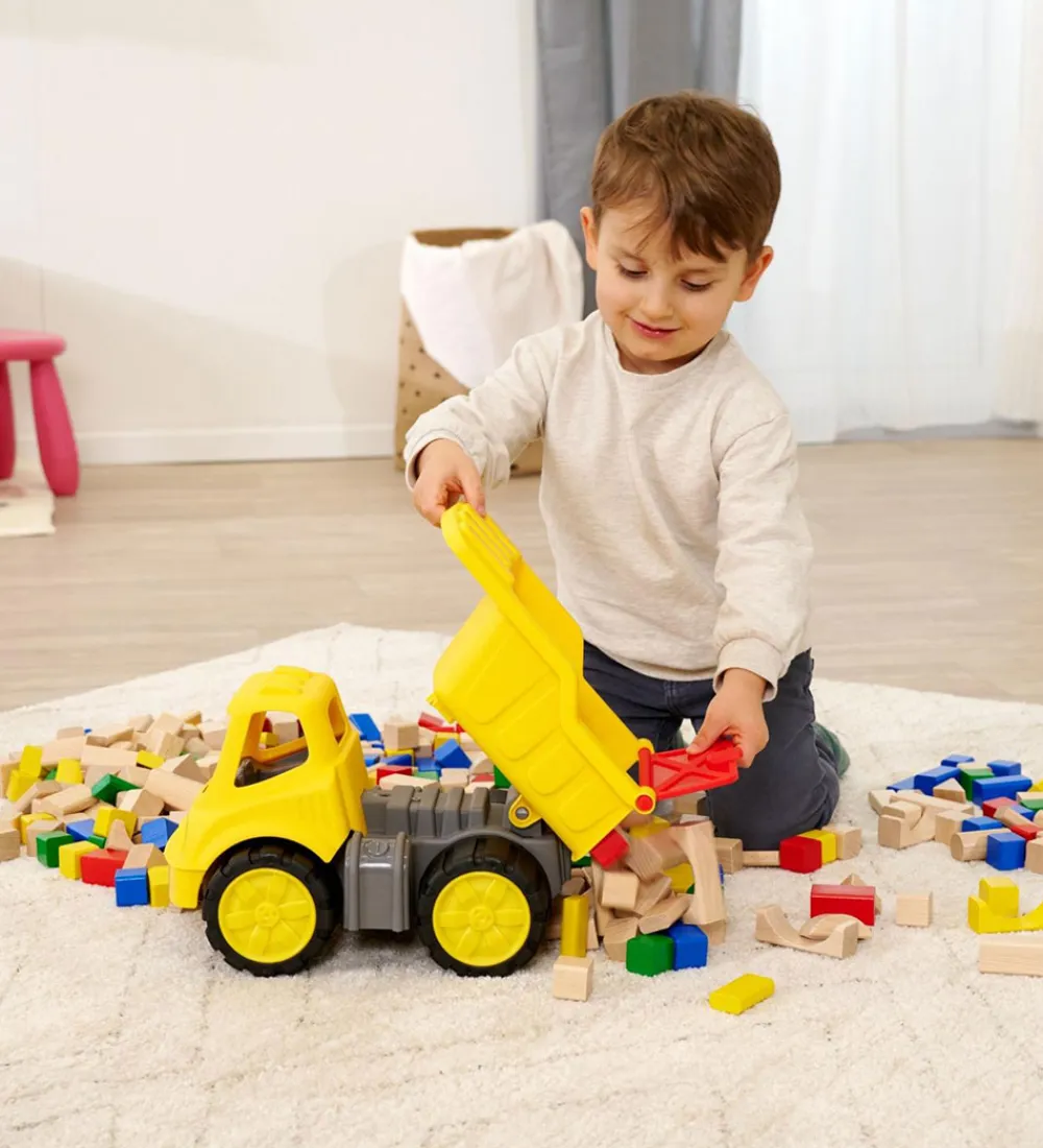Smart BIG arbejdsmaskine i gul med grå, sorte og røde detaljer. Arbejdsmaskinen har et stort lad, som kan vippes op og ned.